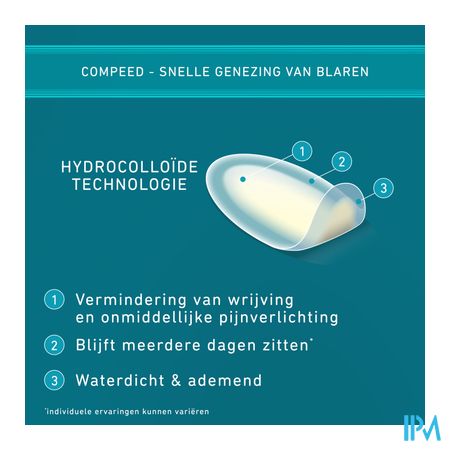 De blarenpleisters van Compeed® zorgen voor onmiddellijke pijnverlichting en een snelle genezing. Het gelkussentje verspreidt de druk op de blaar en neemt tegelijk de wrijving weg. De hydrocolloïdgel in de pleister neemt overtollig vocht op en zorgt voor de beste omstandigheden voor het herstel van de huid.