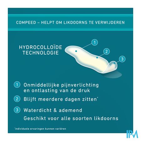 Met de likdoornpleisters van Compeed® kan je de likdoorn beschermen tegen druk en wrijving. Dit neemt de pijn weg en zorgt ervoor dat de likdoorn niet verder aangroeit. Door de hydrocolloïdgel worden de harde huidlagen zachter en kunnen ze gemakkelijk verwijderd worden. De pleisters kunnen ook gebruikt worden om likdoorns te voorkomen.
