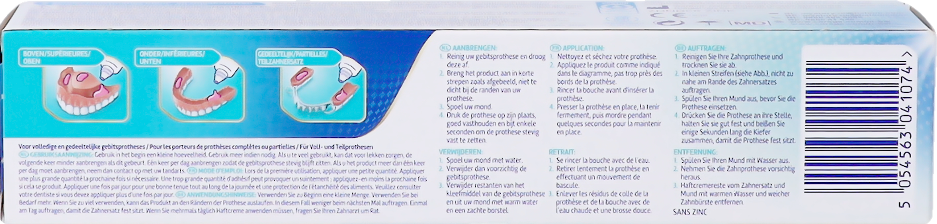 - Verwijder het restant van de kleefcrème van uw tandprothese en mond met warm water en een zachte tandenborstel.