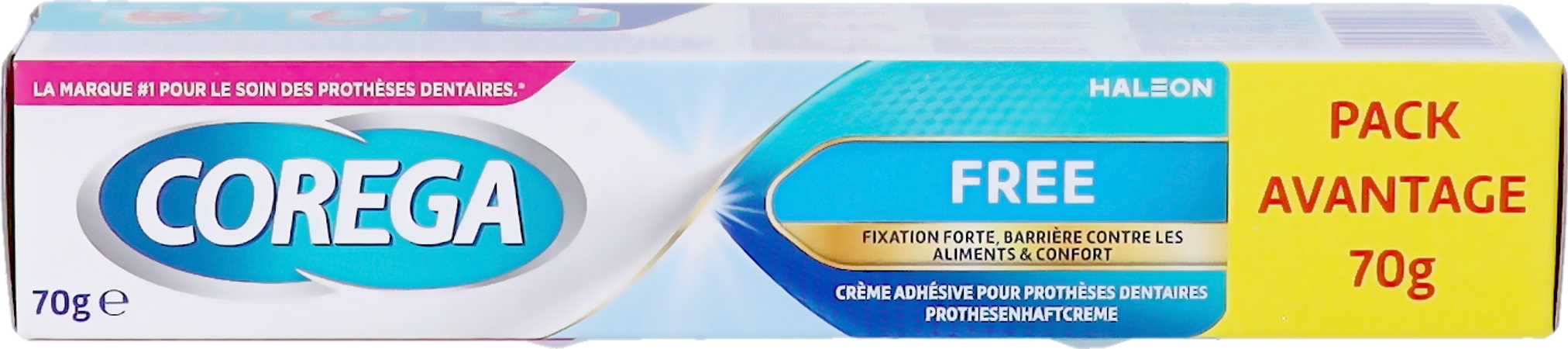 Corega Free maakt deel uit van het Corega gamma kunstgebitkleefmiddelen zonder smaak. Het is vrij van zink en artificiële kleuren.