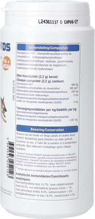 Samenstelling per tablet: Glucosamine hydrochloride (HCl) 600 mg, chondroitinesulfaat (FCHG49) 300 mg, methylsulphonylmethaan 250 mg, hyaluronzuur 6 mg en mangaan 3mg.