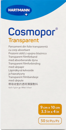 Cosmopor® Transparent is een steriel, zelfklevend transparant folieverband met een absorberend wondkussen, gemaakt van een semipermeabele, waterbestendige en transparante polyurethaanfilm gecoat met een polyacrylaat kleeflaag. De semipermeabele polyurethaanfilm is gecoat met een huidvriendelijke kleeflaag.
