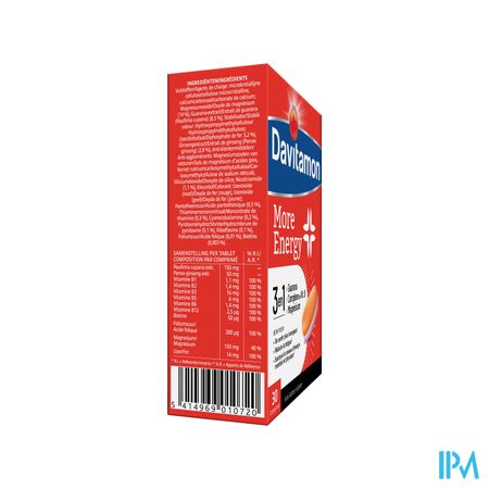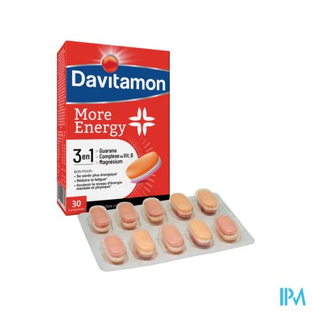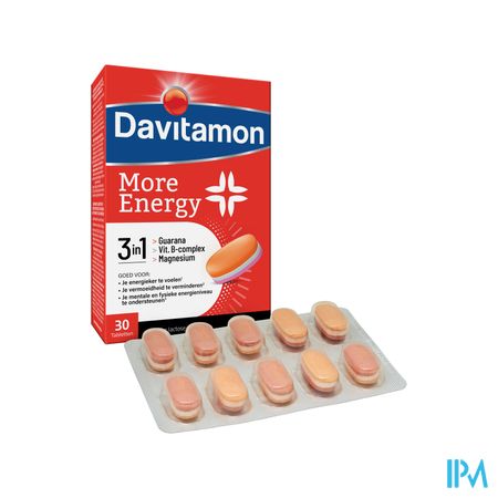 Davitamon More Energy 3-in-1 Comp30 is een voedingssupplement, verkrijgbaar in uw buurtapotheek of online apotheek. Neem niet meer dan de aanbevolen dagelijkse dosis vermeld op de verpakking. Het vervangt geen gezonde levensstijl en gevarieerde en evenwichtige voeding. Vraag raad aan uw apotheker. Het product altijd buiten het bereik van kinderen houden.