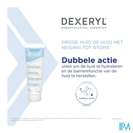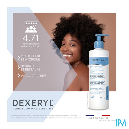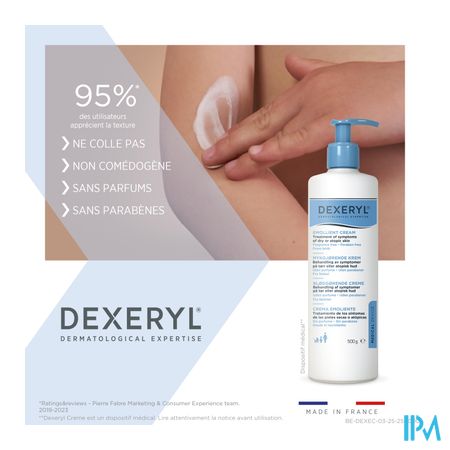 Wettelijke vermelding: DEXERYL® crème is een medisch hulpmiddel. Deze huidbeschermende crème werd speciaal ontwikkeld om doelgericht in te werken op de tekenen en symptomen van de droge huid (xerose), en is met name bedoeld voor gebruik bij bepaalde huidaandoeningen (atopische dermatitis, ichthyosis, enz.) en bij huidklachten als gevolg van uitwendige bestraling (radiodermatitis). Geschikt voor gebruik bij baby's vanaf de geboorte. Lees aandachtig de bijsluiter voor gebruik. Vraag uw apotheker om advies. Dit medisch hulpmiddel is een gereglementeerd gezondheidsproduct dat voorzien is van een CE-markering. Fabrikant: PIERRE FABRE MEDICAL DEVICES, Frankrijk.