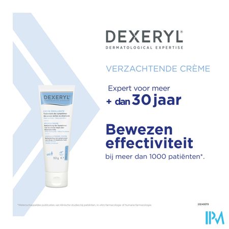 DEXERYL verzachtende crème is speciaal ontwikkeld om de droge en atopische huid van het hele gezin te verzorgen, ook geschikt bij baby's. Deze formule zonder parfum bevat geen parabenen. Hij hydrateert de huid optimaal en oefent een herstellende werking uit op de huidbarrière. Ook wordt het risico op letsels als gevolg van atopisch eczeem beperkt. Met bewezen doeltreffendheid bij alle vormen van xerose: 77,5% minder droge huid na 12 weken¹, 50% minder opvlammingen van atopisch eczeem na 12 weken², minder jeukend* en trekkerig gevoel. Dankzij DEXERYL verzachtende crème gebruiken de patiënten 2 keer minder corticosteroïden². * Ten gevolge van een droge huid ¹Tiplica G.S. et al. The regular use of an emollient improves symptoms of atopic dermatitis in children: a randomized controlled study. J EurAcadDermatolVenereol.2018 Jul;32(7):1180-1187 ²TiplicaG.S. et al. Prevention of Flares in Children with Atopic Dermatitis with Regular Use of an Emollient Containing Glycerol and Paraffin: A Randomized Controlled Study. PediatrDermatol.2017 May;34(3):282-289.
