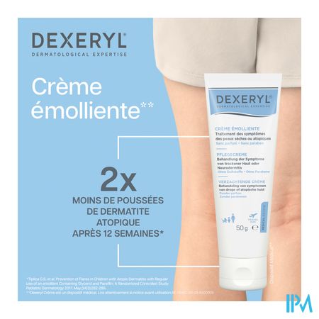 DEXERYL verzachtende crème is een bewezen en betaalbare behandeling voor de symptomen en tekenen van een droge huid bij verschillende huidaandoeningen (atopisch eczeem, ichthyosis...) De crème heeft een unieke dubbele werking, het hydrateert langdurig en herstelt de huidbarrière bij eczeem. Dermatologisch getest, vermindert het de droogheid van de huid¹ met 77,5% en de opvlammingen van eczeem² met 50% na 12 weken. Geschikt voor alle leeftijden vanaf de geboorte, niet plakkerig, zonder parfum en zonder parabenen.