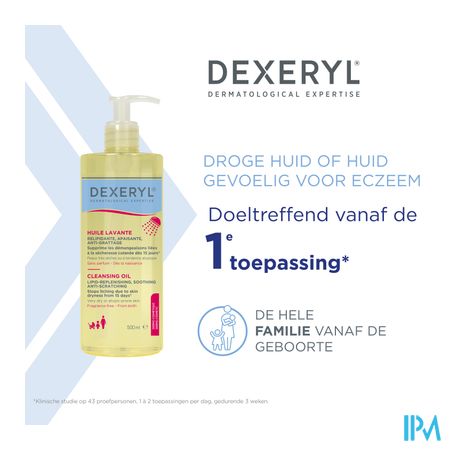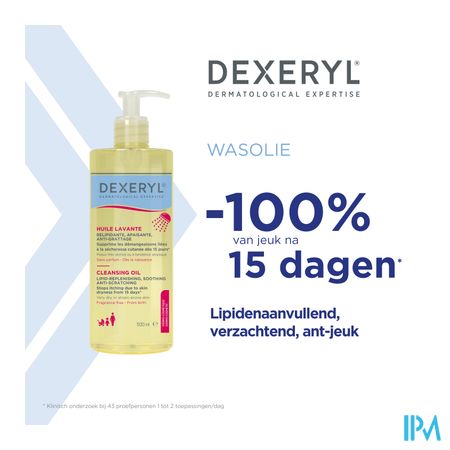 Een droge huid of huid gevoelig voor eczeem kan al snel huidirritaties vertonen bij contact met water en zeep. Dexeryl wasolie is speciaal ontwikkeld voor de droge tot zeer droge huid en de huid met neiging tot atopie. De formule reinigt de huid op milde wijze, oefent een huidkalmerende en lipidenherstellende werking uit zonder de huidbarrière uit balans te brengen. De jeuk is na 15 dagen gebruik¹ met 100% verminderd. Geschikt voor de huid van het hele gezin. De formule zonder zeep en parfum is geschikt voor gebruik bij baby's vanaf de geboorte. De vloeibare textuur is gemakkelijk aan te brengen en omhult de huid met een aangenaam luchtig en zacht schuim, dat al even gemakkelijk weer af te spoelen is.