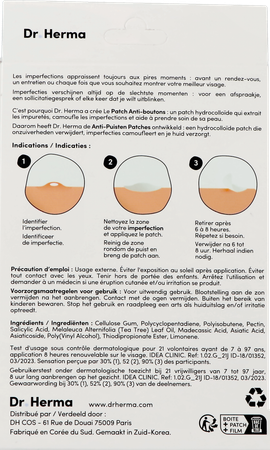 Dr. Herma Anti-Pimple Patch Mix Format biedt een complete oplossing om huidoneffenheden te bestrijden. Het bevat drie pleisterformaten (12 kleine, 2 grote en 2 voor de neus), speciaal ontworpen om puistjes te behandelen door overtollig talg te absorberen en de genezing te versnellen dankzij hydrocolloïdetechnologie. Elk formaat is ontworpen om aan specifieke behoeften te voldoen, waardoor een gerichte en discrete toepassing wordt gegarandeerd.