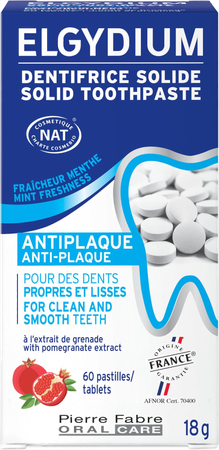 ELGYDIUM vaste tandpasta Antiplak is een tandpasta in de vorm van kauwtabletten om het transport van water en het gebruik van plastic te beperken en tegelijkertijd tandplak te bestrijden. Met het Ecocert Cosmos Natural-certificaat is het gemaakt van 100% natuurlijke ingrediënten. Deze 60 tabletten met granaatappelextract zijn verpakt in een klein glazen potje voor een betere conservering van de tabletten! Dankzij het ontbreken van water is deze tandpasta compacter en is het de ideale metgezel voor vliegreizen of gewoon voor dagelijks gebruik om een goede mondhygiëne te verzekeren.