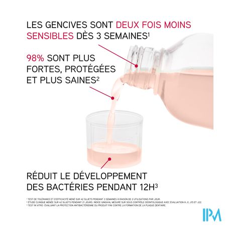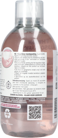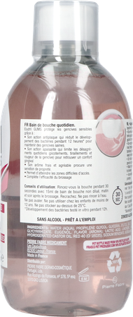 Eludril Gums mondspoeling kalmeert en zuivert gevoelig tandvlees, als aanvulling op het poetsen. Het draagt bij aan de bestrijding van tandplak, de belangrijkste oorzaak van gevoelig en geïrriteerd tandvlees: het tandvlees is 2 keer minder gevoelig na 3 weken gebruik¹. De gebruiksklare en alcoholvrije Eludril Gums mondspoeling biedt 12 uur lang bescherming tegen de bacteriën die verantwoordelijk zijn voor tandplak en vermindert ongemak van het tandvlees (tinteling, strakheid en rood tandvlees). Het combineert doeltreffendheid met plezierig gebruik, dankzij de aangename sensatie van munt en frisheid. Geschikt voor volwassenen en kinderen vanaf 12 jaar. De PET-fles is recycleerbaar en gemaakt van 100% gerecycled plastic.