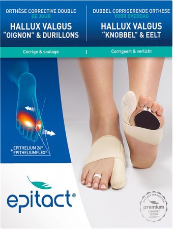 De corrigerende dubbele orthese voor hallux valgus beperkt de ontwikkeling van hallux valgus en verlicht de pijn die gepaard gaat met deze misvorming, terwijl het gebied onder de voorvoet, dat vaak tekenen van verhoorning of oververhitting vertoont, wordt beschermd.