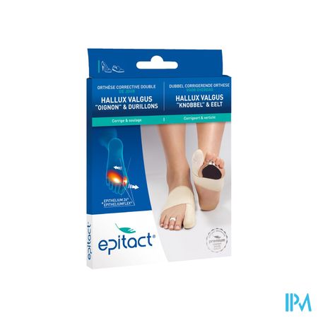 De corrigerende dubbele orthese voor hallux valgus beperkt de ontwikkeling van hallux valgus en verlicht de pijn die gepaard gaat met deze misvorming, terwijl het gebied onder de voorvoet, dat vaak tekenen van verhoorning of oververhitting vertoont, wordt beschermd.