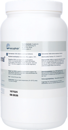 Equi-MSM wordt gebruikt bij sportpaarden ter ondersteuning van de gewrichten en luchtwegen en verbetert ook de kwaliteit van de hoeven en de huid. MSM is een organisch gebonden zwavel. Zwavel is een essentieel element voor het behoud van sterke en gezonde weefsels, vooral in de gewrichten, de huid en de hoeven. Bovendien ondersteunt het de luchtwegen.