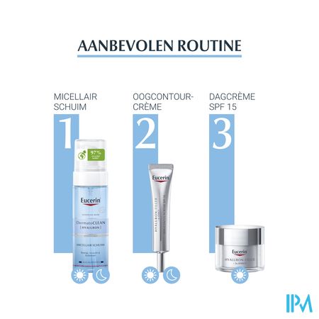 Wijze van gebruik's Morgens en 's avonds reinigen: Het schuim in je hand pompen Met je vingertoppen aanbrengen op je gezicht, hals en decolleté Indien gewenst je gezicht van tevoren natmaken, maar niet noodzakelijk Afspoelen met warm water Je dagelijkse routine Reinigen Reinig de huid grondig met de voor jou geschikte Eucerin DermatoCLEAN [HYALURON] reiniger. Als je hardnekkige waterproof mascara draagt, verwijder die dan vóór het reinigen met Eucerin DermatoCLEAN Reinigingslotion voor Waterproof Oog Make-up. Verzorging Daarna volgt de voor jou geschikte dag- of nachthydratatie en oogcrème.