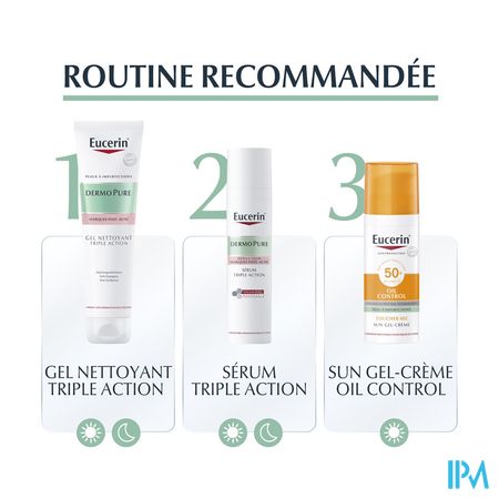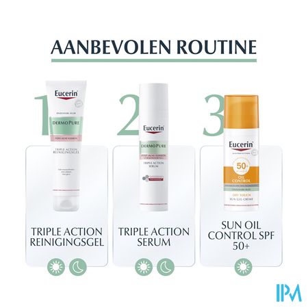 • Daarna een geschikt verzorgingsproduct gebruiken. We raden het Eucerin DermoPure Triple Action Serum aan.