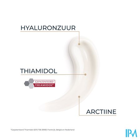 Thiamidol vermindert ouderdomsvlekken zichtbaar en laat de huid er egaler en jonger uitzien; Arctiin stimuleert de vernieuwing van collageen (ex vivo), wat bijdraagt aan de verbetering van de elasticiteit; en Hyaluronzuur hydrateert intensief en maakt de huid gladder.