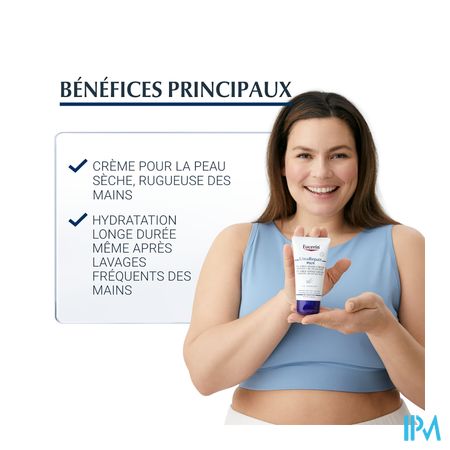 De Eucerin UreaRepair 5% Urea Handcrème geeft de droge en ruwe huid van de handen de dagelijkse verzorging die ze nodig hebben. De crème bevat een specifieke combinatie van ingrediënten: 5% Urea, Ceramiden en andere Natuurlijke Hydratatiefactoren (NMF's, Natural Moisturizing Factors), die vocht binden en helpen de natuurlijke beschermende barrière van de huid te versterken om haar te beschermen tegen meer vochtverlies.