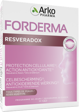 Dankzij hun expertise hebben de Arkopharma-laboratoria speciaal Forderma Resveradox (Perles de Peau®) ontwikkeld op basis van Resveratrol, Zink en Selenium.