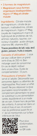 Citraat-malaat magnesium, kaliumcitraat, maltodextrine, magnesiumcitraat, Hypro-ri® Mag (mariene magnesiumoxide en hydrolysaat van rijsteiwit), natuurlijke aroma's, taurine, zuurteregelaar: citroenzuur, vitamine B6, vitamine B12.