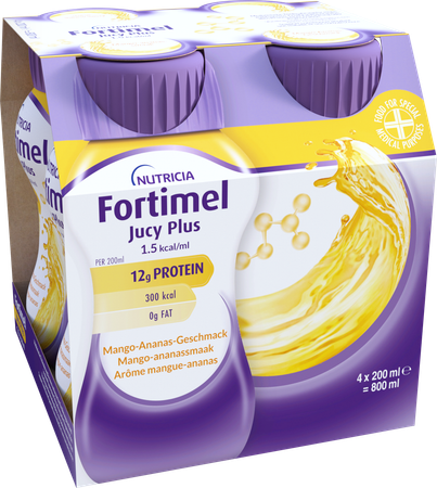 Voeding voor medisch gebruik. Dieetvoeding bij ziektegerelateerde ondervoeding. Fortimel Jucy Plus is een energierijke, vetvrije drinkvoeding. Glutenvrij en laag in lactose.
