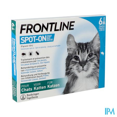 Frontline® Spot-On is een gemakkelijk aan te brengen vloeistof die uw kat goede bescherming tegen vlooien en teken biedt. Frontline® Spot-On doodt vlooien binnen 24u en teken binnen 48u. Het beschermt je kat 2 weken tegen teken en 4 weken tegen vlooien.