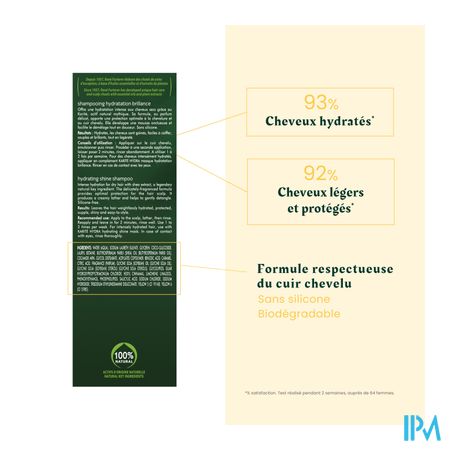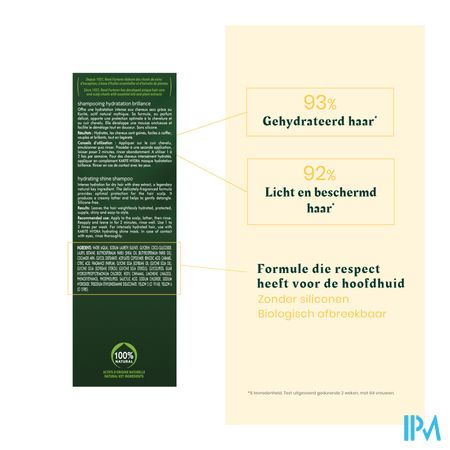 Deze hydraterende shampoo voor droog haar combineert intens hydraterende karité-olie met Cimentrio, een bestanddeel dat de haarschubben versterkt, voor soepel en glanzend haar. De shampoo laat het haar zacht aanvoelen, zonder het te verzwaren. Het haar is gevoed, beschermd en makkelijker te stylen. 100% natuurlijke actieve ingrediënten. Zonder siliconen.