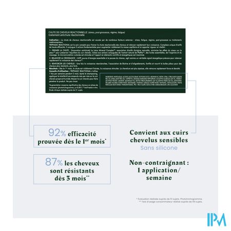 Deskundige verzorging voor plotseling haarverlies veroorzaakt door verschillende factoren : stress, vermoeidheid, dieet, zwangerschap... Vanaf de eerste maand* wordt de haaruitval zichtbaar vertraagd en de groei van bestaande haren bevorderd. Het haar wordt dikker en krijgt snel weer kracht en dichtheid. Bewezen effectiviteit tegen haaruitval bij 92% van de gebruikers*. 94% ingrediënten van natuurlijke oorsprong. Siliconenvrij. *Evaluatie uitgevoerd op 51 proefpersonen. Fototrichogram