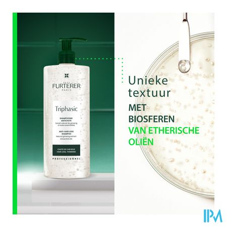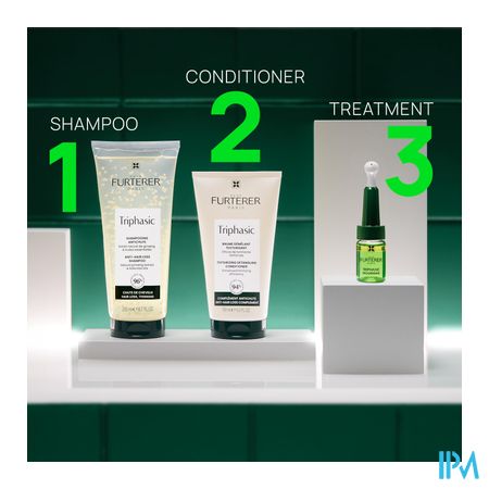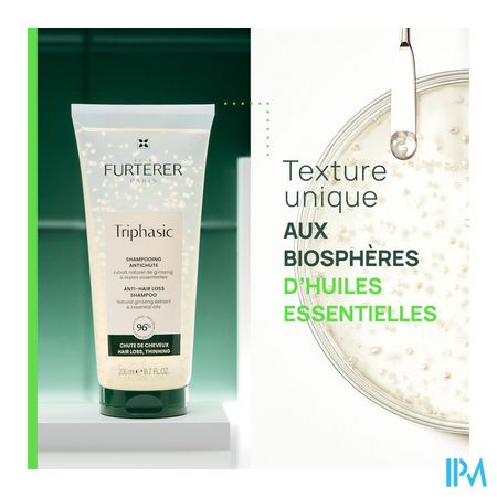 De TRIPHASIC Anti-Hair Loss Treatment Shampoo remt haaruitval af zonder de hoofdhuid te beschadigen. De siliconenvrije formule combineert vitamine B5, natuurlijke extracten van biologische Pfaffia en Ginseng om de hoofdhuid te helpen versterken. De stimulerende krachten van bolletjes met essentiële oliën vertragen haaruitval en bevorderen een vollere, dichtere haargroei. De transparante textuur van het product onthult witte en parelmoerkleurige bolletjes die tijdens het wassen delicaat openbarsten tussen de vingers. Het haar is mild gereinigd en sterker, gemakkelijk te ontwarren, zacht en glanzend. Bestaat voor 96% uit bestanddelen van natuurlijke oorsprong. Vrij van siliconen en gesulfateerde oppervlakteactieve stoffen. Biologisch afbreekbare formule*. *Volgens OESO301B.