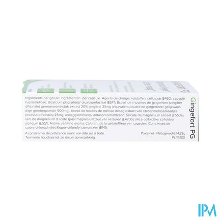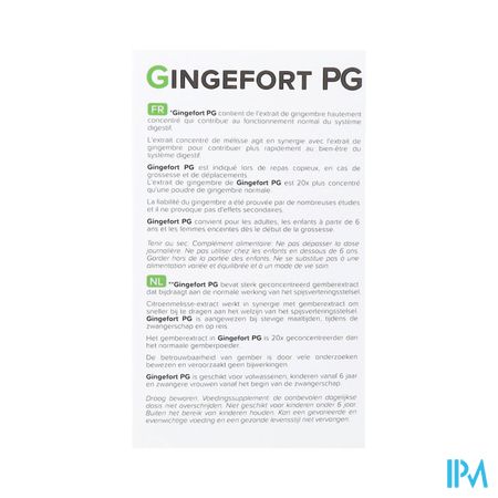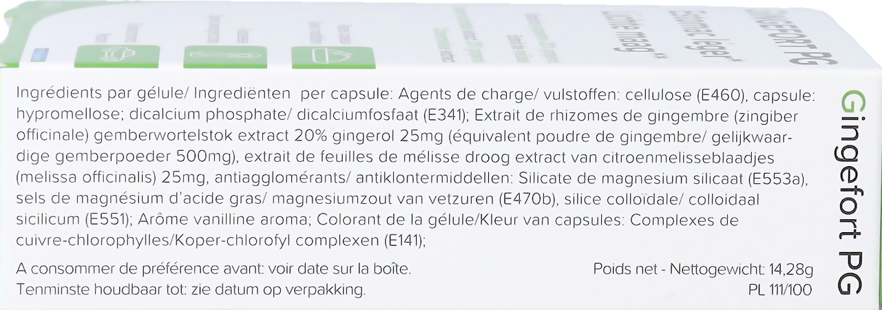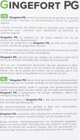 Gingefort PG bevat sterk geconcentreerd gemberextract dat bijdraagt aan de normale werking van het spijsverteringsstelsel. Het gemberextract in Gingefort PG is 20x geconcentreerder dan het normale gemberpoeder. De betrouwbaarheid van gember is door vele onderzoeken bewezen en veroorzaakt geen bijwerkingen. Citroenmelisse-extract werkt in synergie met gemberextract om sneller bij te dragen aan het welzijn van het spijsverteringsstelsel.