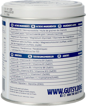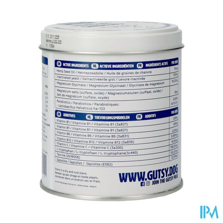 Gutsy Calming Supplement helpt jouw hond ontspannen tijdens spannende momenten, bij stress of gewoon om beter te slapen. De krachtige formule combineert hennepzaadolie, magnesium en B-vitaminen met parabiotica voor een natuurlijke ondersteuning van zenuwen en stemming.