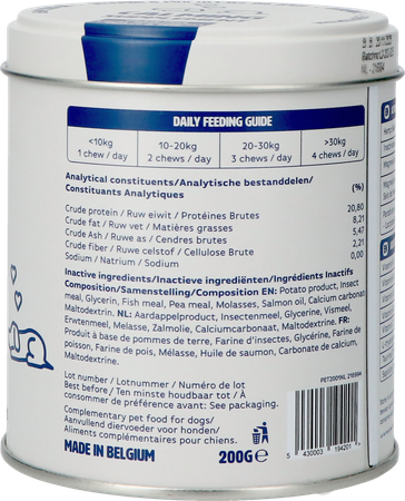 Aardappelproduct, Insectenmeel, Glycerine, Vismeel, Erwtenmeel, Melasse, Zalmolie, Calciumcarbonaat, Maltodextrine