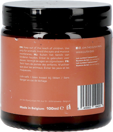 Onze Gutsy Paw Balm bevat alleen wat écht telt: een krachtige mix van natuurlijke oliën, boters en was die samen de pootjes en neuzen van jouw hond verzachten, herstellen én beschermen.