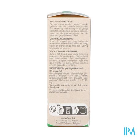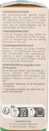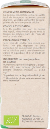 Bevochtigingsmiddel: plantaardige glycerine*; alcohol* (35% vol.); water; glycerinemaceraat van knoppen van plataan* (Platanus orientalis L.). - 113,3 mg**