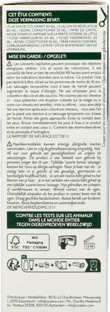 Ingrediënten Haarkleuring: Laureth-4, Propylene glycol, Aqua (water), PEG-2 Oleamine, Ethanolamine, Oleic acid, p-Phenylenediamine, 4-Chlororesorcinol, Aloe barbadensis (Aloe Vera) leaf juice, Hamamelis virginiana (Witch Hazel) leaf extract, Betula Alba (Birch) leaf extract, Echinacea angustifolia (Echinacea) root extract, Juglans regia (Walnut) eaf extract, Rheum Officinale Stem extract, Cinchona calisaya (Cinchona) bark extract, Limnanthes alba (Meadowfoam) seed oil, Tetrasodium glutamate diacetate, Cetrimonium chloride, Sodium metabisulfite, Glycerin.