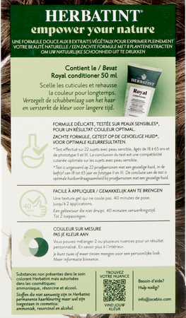 De verpakking bevat 1 flesje kleurstof, 1 flesje fixeermiddel, 1 minisize Royal conditioner en handschoenen.
