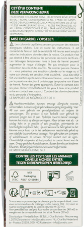 Advies: Haarkleurstoffen kunnen ernstige allergische reacties veroorzaken. Volg de instructies. Het is aan te raden een gevoeligheidstest te doen 48 uur vóór het gebruik. Dit product is niet bestemd voor gebruik bij personen jonger dan 16 jaar.