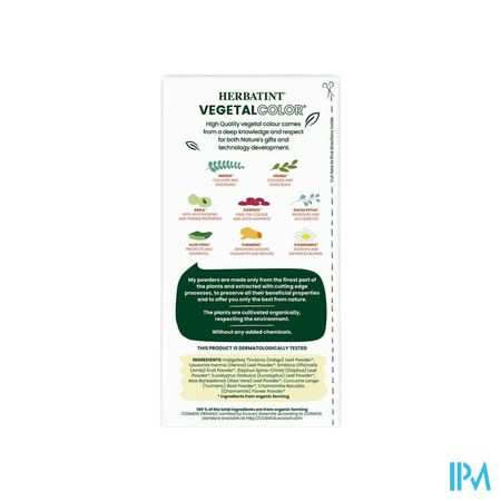 Ingrediënten: Indigofera Tinctoria (Indigo) Bladpoeder*, Lawsonia Inermis (Henna/Henné) Bladpoeder*, Emblica Officinalis (Amla) Fruitpoeder*, Ziziphus Spina-Christi (Ziziphus/ Sidr) Bladpoeder*, Eucalyptus Globulus (Eucalyptus/Eucalipto) Blad Poeder*, Aloë Barbadensis (Aloë Vera) Bladpoeder*, Curcuma Longa (Kurkuma/Kurkuma) Wortelpoeder*, Chamomilla Recutita (Kamille/Camomilla) Bloempoeder*.