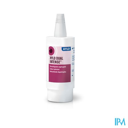 HYLO DUAL INTENSE®-kunsttranen die, dankzij hun bijzonder hoge concentratie hyaluronzuur met lange keten van 0,2% zeer visceus zijn en zich daardoor lang aan het oogoppervlak blijven hechten. Hierdoor wordt het oog op een bijzonder intensieve en duurzame manier van een stabiele vochtfilm voorzien. Hyaluronzuur is een lichaamseigen stof, met als eigenschap een bijzonder hoog waterbindend vermogen. Tegelijkertijd verminderen de druppels de wrijving tussen het ooglid en het hoornvlies, wat bijkomende irritatie van het oog voorkomt en voor een aangenaam gevoel zorgt