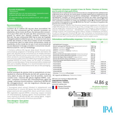 Ingrediënten: Synergetisch plantenextract getitreerd in polyfenolen en EGCG (Groene theebladeren, Guaranazaden, wijnstokzaden en schil, grapefruit, zwarte wortelwortel) vitamine B3, plantaardige capsule (HPMC, kleurstoffen: kopercomplex van chlorophyllins), vitamines ED-B9- B12-B6, emulgator: magnesiumzouten van vetzuren, chroomchloride.