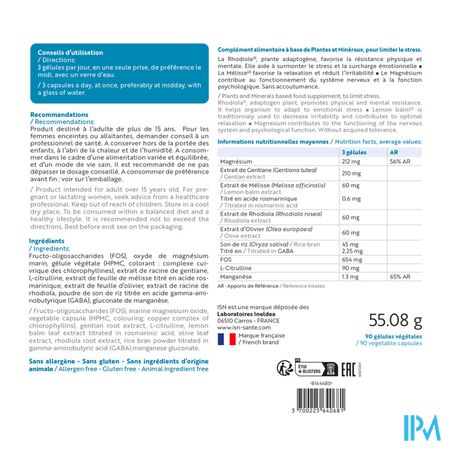 Ingrediënten: fructo-oligosachariden (FOS), magnesiumoxide uit de zee, plantaardige capsule (HPMC, kleurstof: koperchlorofylcomplex), gentiaanwortelextract, L-citrulline, citroenmelissebladextract getitreerd in rosmarijnzuur, olijfbladextract, rhodiola-wortelextract, rijstzemelenpoeder getitreerd in GABA, mangaangluconaat.