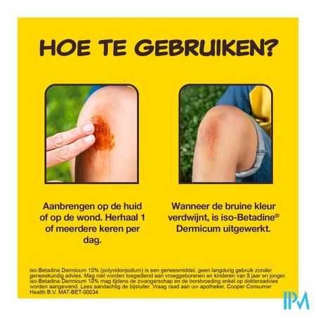 - Wanneer de bruine kleur verdwijnt, is iso-Betadine Dermicum uitgewerkt.