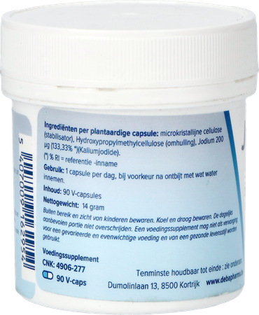Jodium 200mcg V-caps 90 Deba is een voedingssupplement, verkrijgbaar in uw buurtapotheek of online apotheek. Neem niet meer dan de aanbevolen dagelijkse dosis vermeld op de verpakking. Het vervangt geen gezonde levensstijl en gevarieerde en evenwichtige voeding. Vraag raad aan uw apotheker. Het product altijd buiten het bereik van kinderen houden.