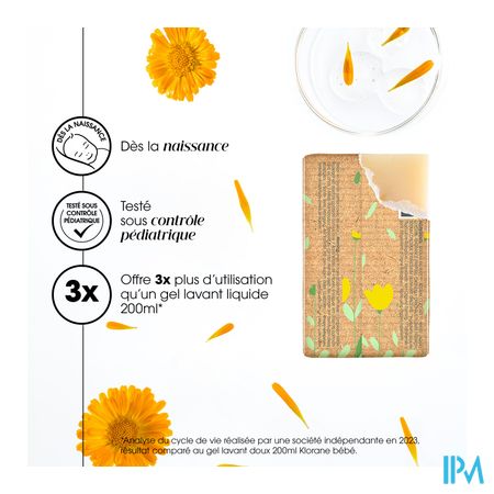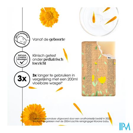 Klorane Baby BIO gecertificeerde vaste zeep hydrateert en wast de babyhuid in alle zachtheid zonder ze uit te drogen. De formule, die voor 99% uit natuurlijke ingrediënten bestaat met BIO Calendula-extract en BIO plantaardige glycerine, helpt het microbioom van de huid in evenwicht te brengen.