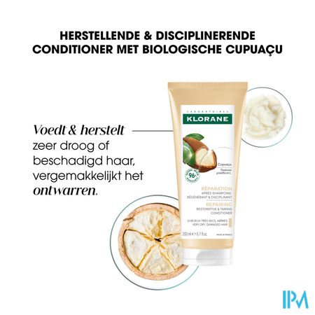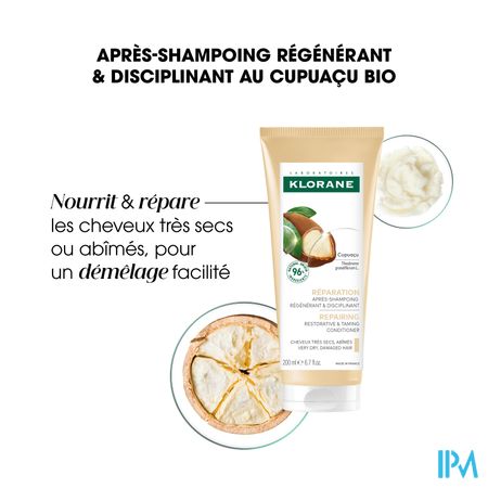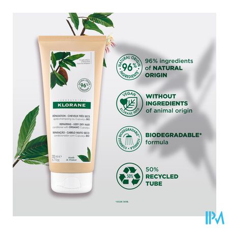 Dit biologisch afbreekbare* haarverzorgingsproduct bestaat voor 96% uit bestanddelen van natuurlijke oorsprong en is verrijkt met ultra-voedende actieve bestanddelen en vetzuren. Speciaal geformuleerd voor zeer droog, breekbaar haar dat beschadigd is door steilen, borstelen of kleuren Conditioner met BIO Cupuaçuboter van Klorane voedt en herstelt zeer droog, golvend, krullend of kroezelig haar. Door de haarvezel glad te strijken, vergemakkelijkt de Conditioner het ontwarren, voor onmiddellijk glanzend, beschermd en resistent haar**. Deze milde reinigende formule kan het ook worden gebruikt als een reinigend haarverzorgingsproduct in plaats van de gebruikelijke shampoo.