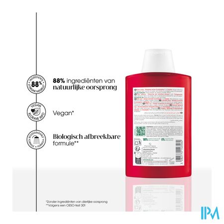 *Consumentengebruikstest, 42 personen na 8 weken gebruik. **Volgens OECD-test 301. ***In vitro antioxidanttest. ****Klorane info: zonder ingrediënten van dierlijke oorsprong.