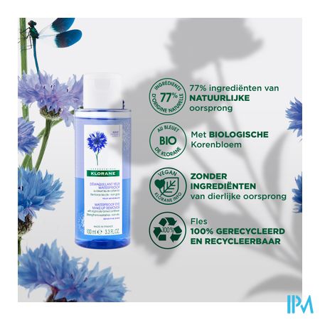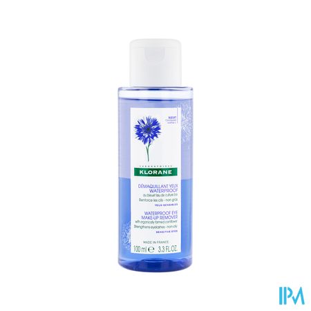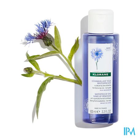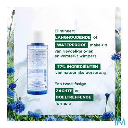 De Waterproof oog make-up remover met BIO Korenbloem van Klorane heeft een dubbele werking: het verwijdert onmiddellijk en volledig alle soorten langhoudende make-up, zelfs waterproof make-up, en versterkt de wimpers zonder een vettig laagje achter te laten. Deze make-up remover is verrijkt met biologisch korenbloemwater dat kalmerende en ontzwellende eigenschappen bezit. De formule is speciaal ontwikkeld voor de meest gevoelige ogen en is ook geschikt voor mensen die contactlenzen dragen.