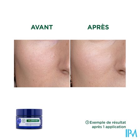 Het herstelproces van de huid treedt 's nachts in volle werking: op deze manier wordt de huid beschermd tegen oxidatie en wordt de doorbloeding van de huid optimaal gestimuleerd. Om dit proces te helpen en te versnellen, heeft Klorane deze Hydraterende nachtverzorging met BIO korenbloem, dat voor 96% uit bestanddelen van natuurlijke oorsprong bestaat, samengesteld. Deze ultra smeltende verzorging, die voor het slapen gaan in een dun laagje of als masker aangebracht kan worden, werkt als een natuurlijke booster en doordrenkt de huid met al haar weldadige werkzame stoffen. e gelaatstrekken zijn ontspannen, de huid is uitgerust en geregenereerd, net zoals na een goede nachtrust*. De smeltende, niet-comedogene en hoogtolerante textuur wordt aangebracht volgens het Klorane ritueel dat aan de binnenzijde van het doosje nader belicht wordt.