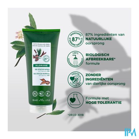 Klorane Douchegel met Cederschors is speciaal ontwikkeld om alle huidtypes te reinigen zonder deze uit te drogen. Rijk aan vetzuren en biologische Cupuaçuboter, hydrateert het de opperhuid langdurig* en respecteert het evenwicht ervan. De geltextuur creëert een zacht schuim onder de douche, reinigt de huid grondig en laat deze soepel en aangenaam geparfumeerd achter. De formule is biologisch afbreekbaar** en veganistisch***. Het is verpakt in een praktische tube met een ecologisch ontworpen dop: platter, lichter en met 40% minder plastic.Langdurig gehydrateerde huid: +24% na 21 dagen - corneometrietest op 16 personen.volgens de OESO-norm 301B.Bevat geen ingrediënten van dierlijke oorsprong.
