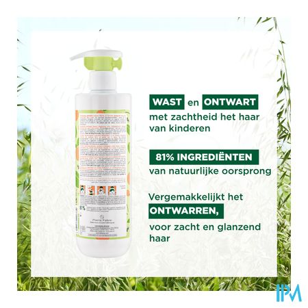De zachte Ontwarrende Shampoo van Laboratoires Klorane, subtiel geparfumeerd met perzik, reinigt in alle zachtheid de hoofdhuid en het haar van kinderen vanaf 3 jaar. De biologisch afbreekbare* formule met 81% aan ingrediënten van natuurlijke oorsprong is ideaal voor frequent gebruik. Het lichte schuim met een heerlijke perzikgeur reinigt het haar op milde wijze en is makkelijk uit te spoelen. De formule biedt het haar de zachtheid en de hydratatie die het nodig heeft, zonder in de ogen te prikken. Met deze kindershampoo rijk aan BIO haver is het haar makkelijker te ontwarren. Het soepele, glanzende haar is gehydrateerd en voelt heerlijk zacht** aan. De speelse en kleurrijke verpakking zorgt ervoor dat lichaamshygiëne plezier, spel en leren combineert.* Volgens de OECD 301B*norm**100% tevreden: Gevoed en gehydrateerd haar, glanzend, soepel, makkelijk te ontwarren.