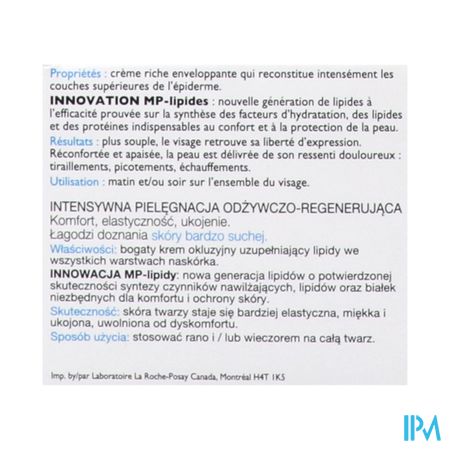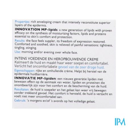 Bijzonder goed smeerbare en voedende crème die de bovenste lagen van de opperhuid intensief herstelt. INNOVATIE MP-lipidenEen nieuwe generatie lipiden met een bewezen effectieve invloed op de aanmaak van hydratatiefactoren, lipiden en proteïnen die onmisbaar zijn voor een prettig aanvoelende en beschermde huid. COSMEDIA SP, een textuurgevend actief, zorgt voor een zeer prettig gevoel bij het aanbrengen van de crème. Het fusiepunt van de crème is identiek aan de huidtemperatuur, wat een sensationeel gevoel geeft alsof de crème op de huid smelt.